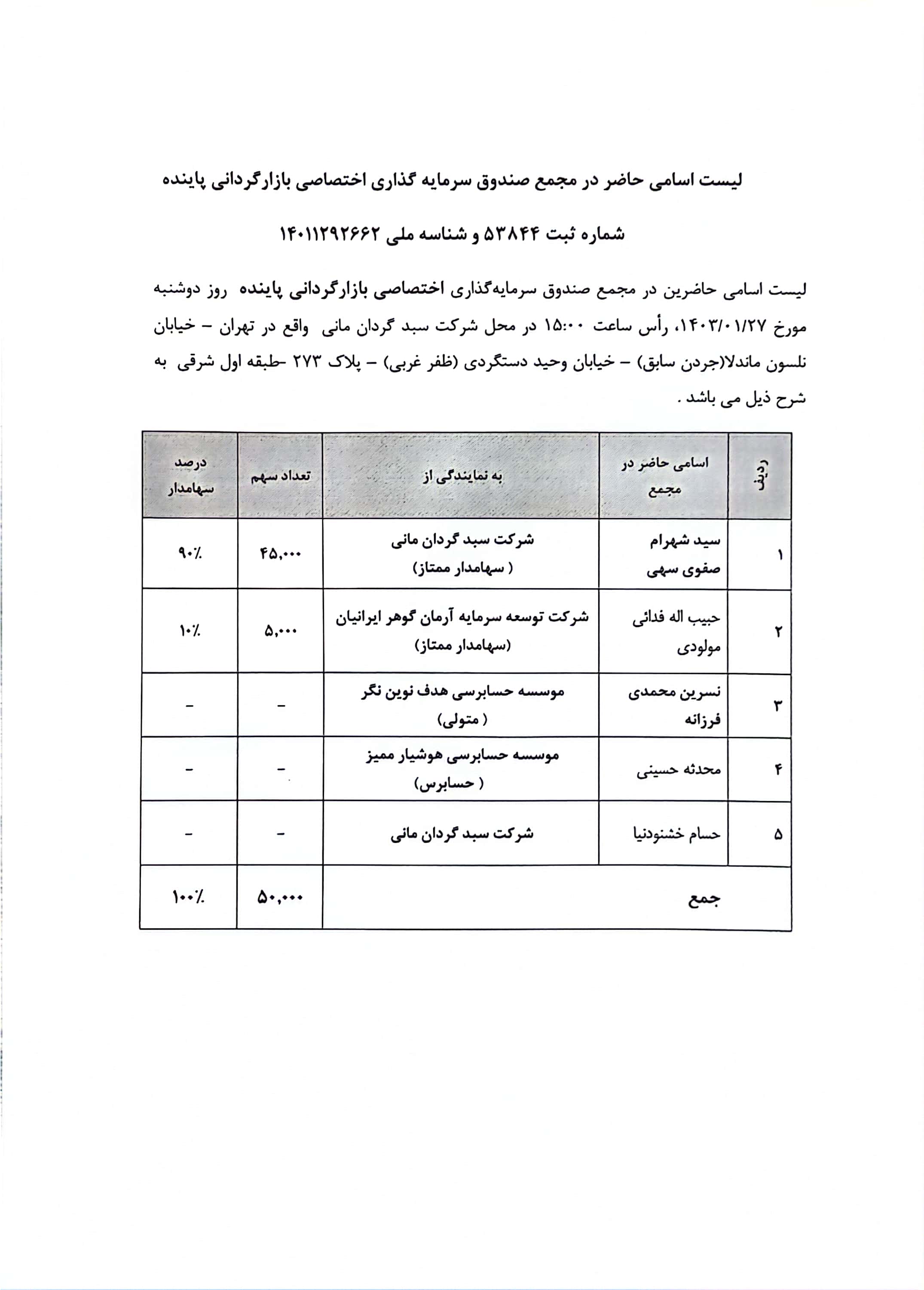 اسامی حاضرین در مجمع صندوق سرمایه گذاری اختصاصی بازارگردانی پاینده مورخ 1403/03/19 ساعت 14:00