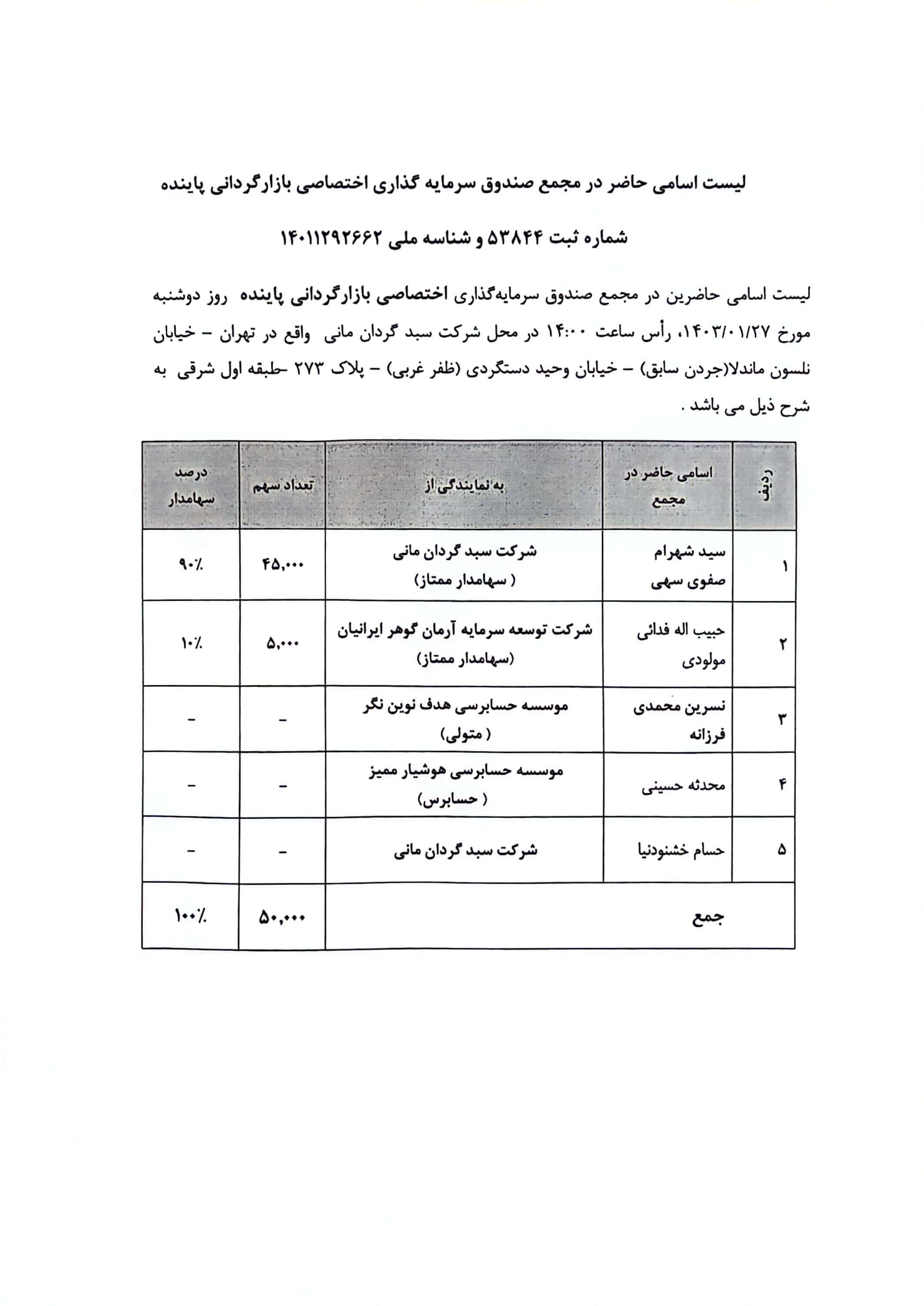 لیست اسامی حاضرین در مجمع صندوق سرمایه گذاری اختصاصی پاینده مورخ ۱۴۰۳/۰۱/۲۷ ساعت ۱۵:۰۰